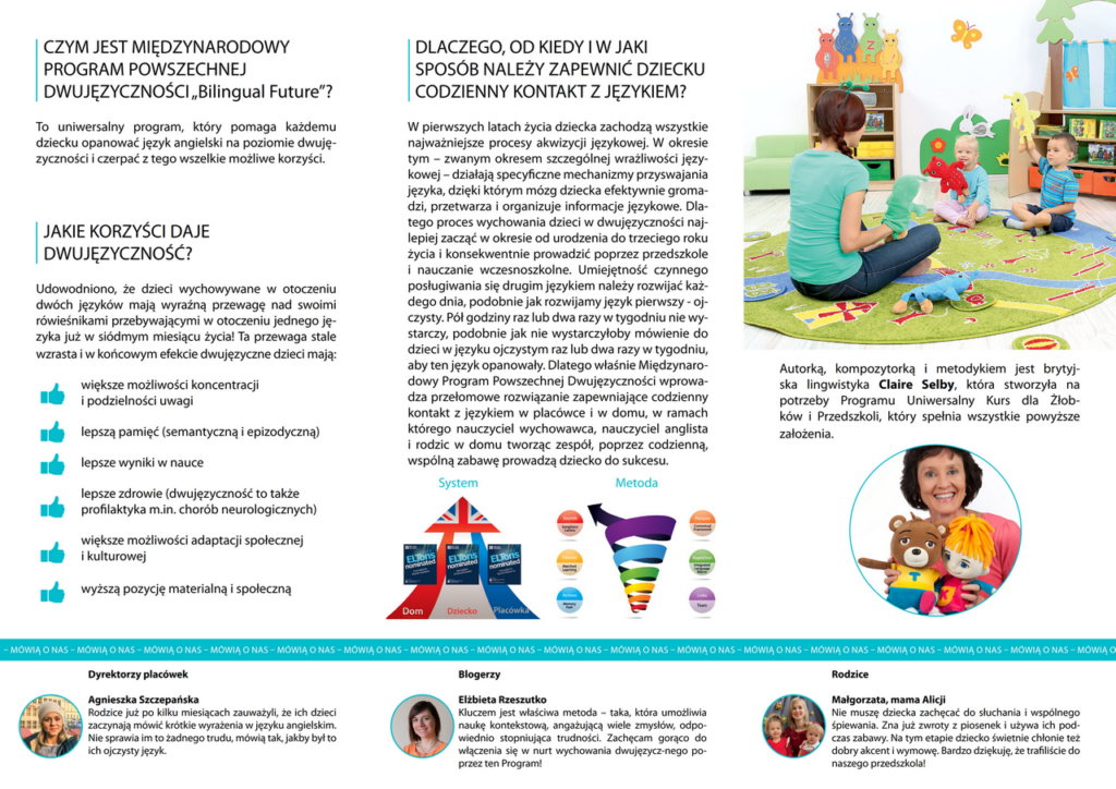 Przedszkole przystąpiło jako partner do Programu Powszechnej Edukacji Dwujęzycznej „Bilingual Future”. Zasadniczym celem Programu jest codzienne, kontekstowe osłuchiwanie dzieci z językiem angielskim w okresie szczególnej wrażliwości językowej (0-6) tak, żeby angielski nigdy nie stał się dla nich językiem obcym. W ten sposób właśnie dziecko naturalnie – czyli na tych samych zasadach jak pierwszy – nabywa drugi język. Prócz samych umiejętności językowych dwujęzyczność wiąże się z licznymi korzyściami dla intelektu, psychiki i zdrowia dziecka. Mózg otrzymuje zdrową dawkę treningu, a przy tym wiedzę i umiejętności, które na tym etapie rozwoju utrwalają się nadzwyczaj szybko i efektywnie.