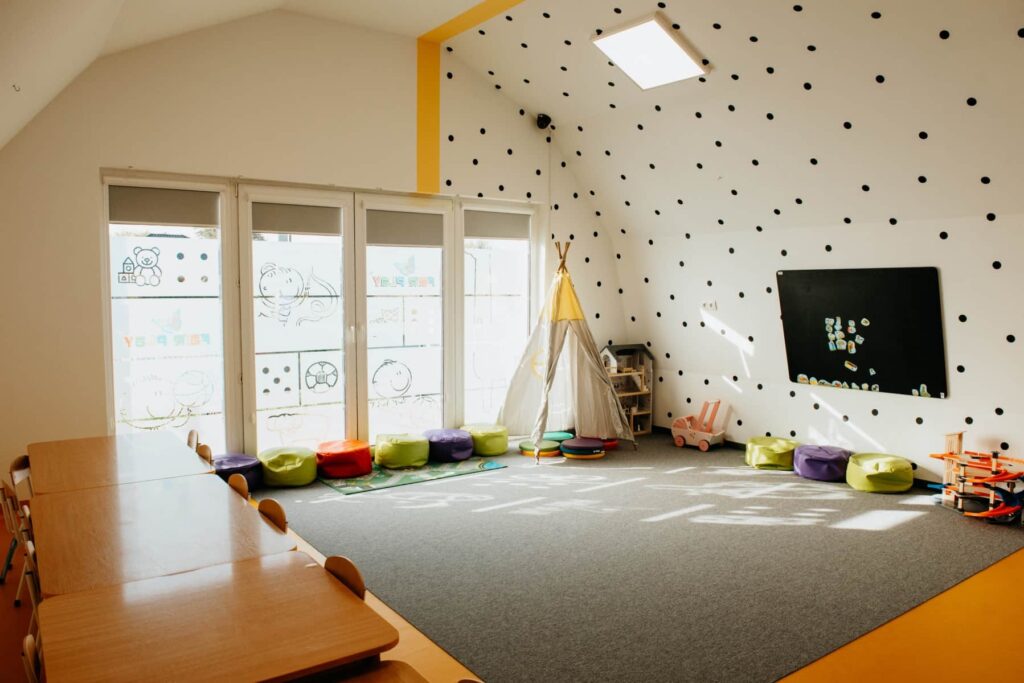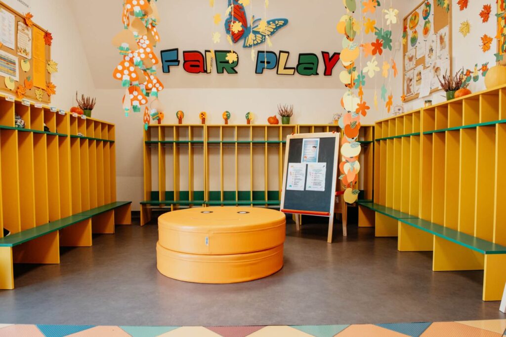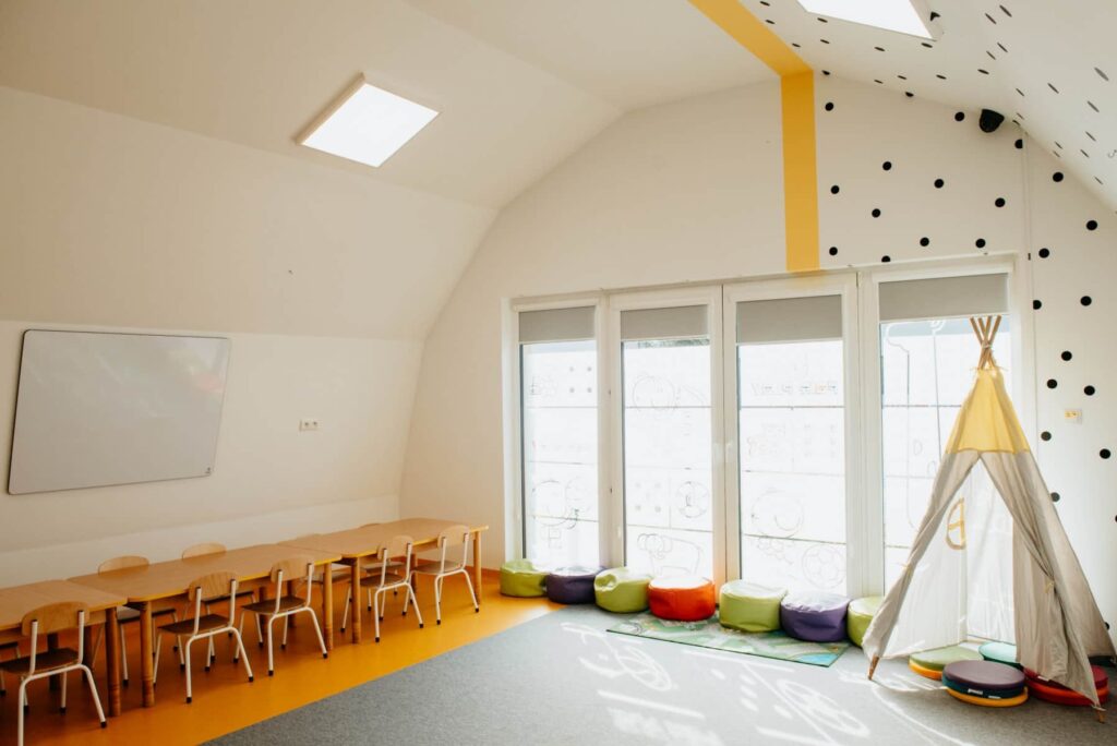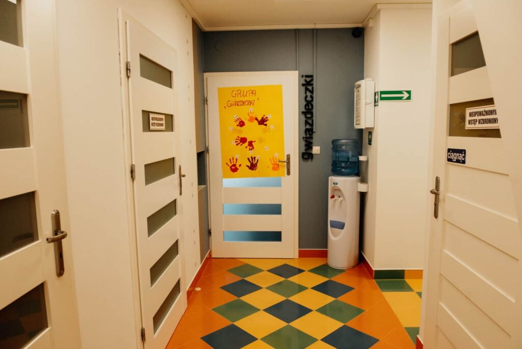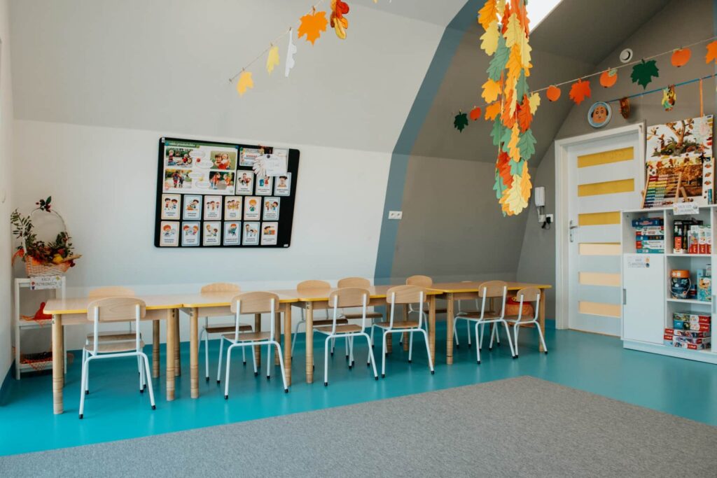 Wnętrze budynku jest po kapitalnym remoncie. Pomieszczenia zostały wyposażone w nowe meble i klimatyzację, a na ścianach pojawiły się piękne, wesołe kolory. Nasze przedszkole w Niepołomicach sprzyja rozwojowi dziecka i sprawia, że czuje się jak w domu.