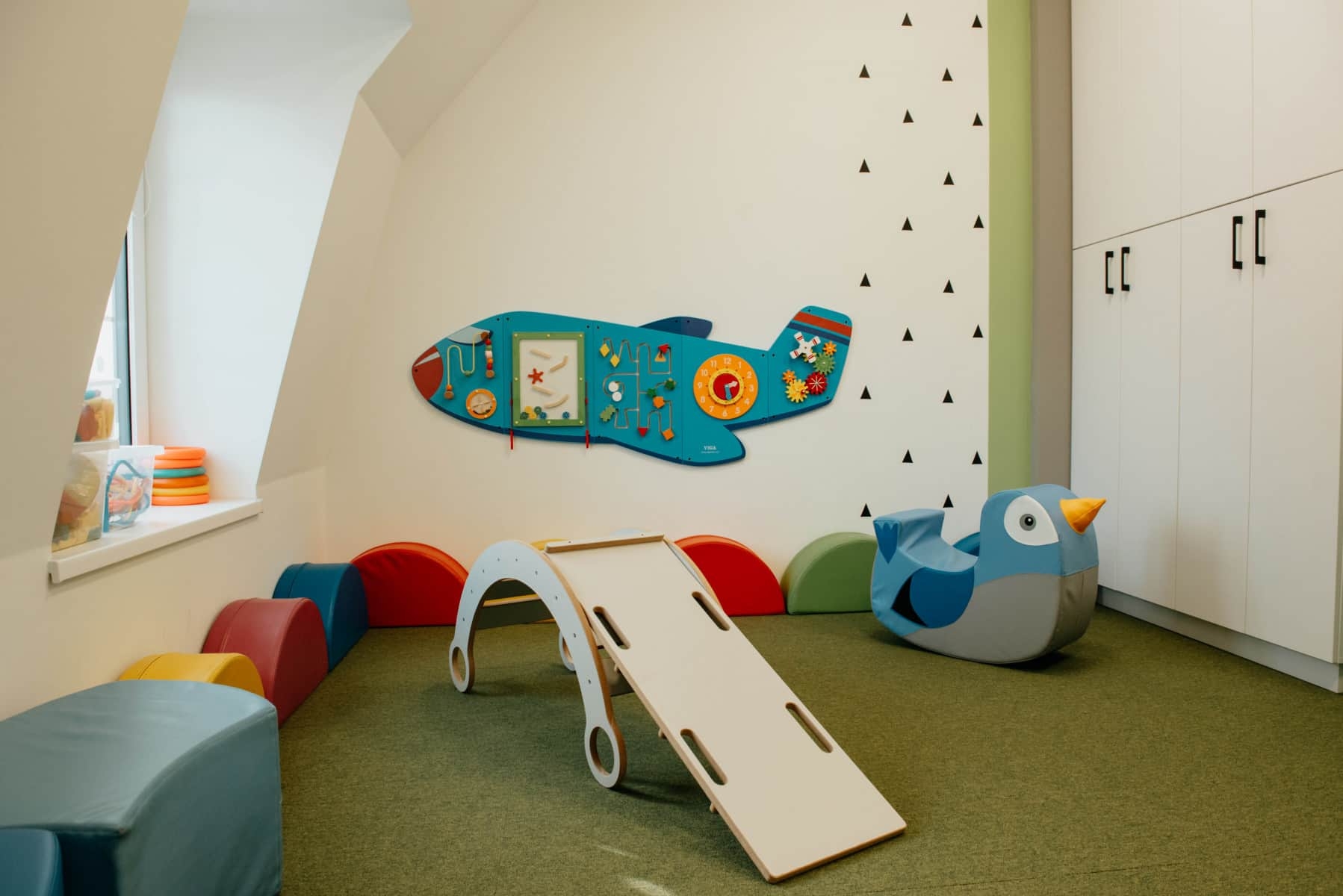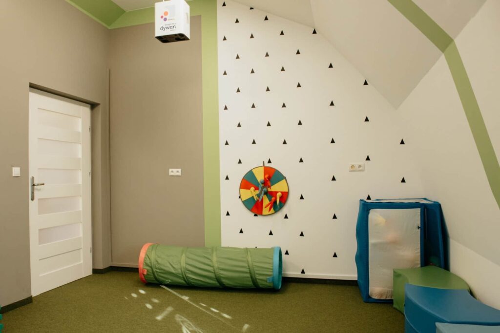 Na półkach znajdziesz głównie drewniane zabawki i puzzle, a na podłodze – magiczny dywan, który ma zachęcić dzieci do ćwiczeń, gier i zabaw ruchowych. Dbamy o to, aby nasi mali podopieczni rozwijali motorykę, koordynację wzrokowo-ruchową i spostrzegawczość.