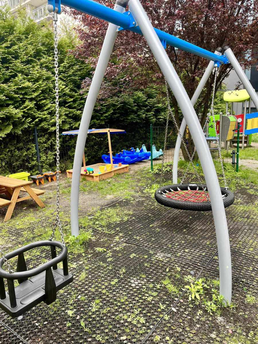 Dysponujemy także dwoma placami zabaw, jeden przeznaczony jest dla dzieci młodszych – żłobkowych, a drugi dla naszych przedszkolaków.